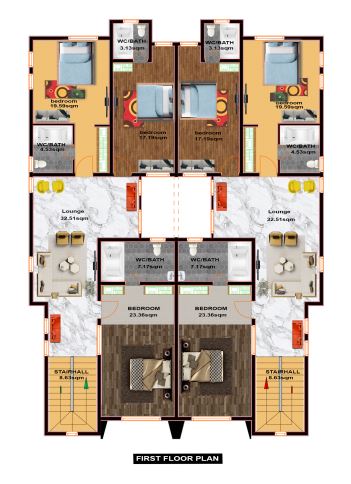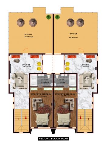 Maid’s Room (9.37 SQM), Kitchen (15.97 SQM), Living Room (55.38 SQM), Entrance Porch (6.95 SQM), Bedroom 1 (19.59SQM), Bedroom 2 (17.19 SQM), Bedroom 3 (23.36SQM), Master’s Bedroom (23.57 SQM), Lounge 1 (32.51 SQM), Lounge 2 (32.32 SQM), Sit-out (48.96 SQM). |